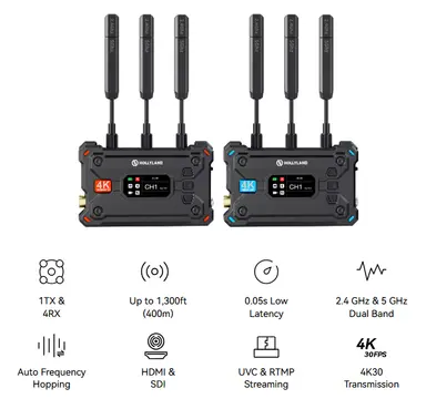 Wireless Transmitter and Receiver Set Transmit UHD 4K30 Video up to 1300′ HDMI/SDI Inputs and Outputs 2.4 and 5 GHz Frequency Bands Supports UVC and RTMP for Streaming 650′ Transmission in Broadcast Mode Smart Channel Scanning, Bright LCD Low 50 ms Latency, 12 Mb/s Bit Rate DC, L-Series, and USB-C Power Options In the Box :Hollyland Pyro S 4K HDMI/SDI Wireless Video Transmission System Hollyland Pyro S 4K HDMI/SDI Wireless Video Receiver Hollyland Pyro S 4K HDMI/SDI Wireless Video Transmitter 7 x Hollyland Paddle Antenna for Pyro Series (2.4/5 GHz) Hollyland Rotatable Cold Shoe Adapter Mount for Wireless Unit USB-C OTG Adapter Hollyland DC Power Adapter for Pyro S (12 VDC, 2A)
